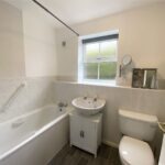 Bath with shower over, wash hand basin, WC, central heating radiator, double glazed window.