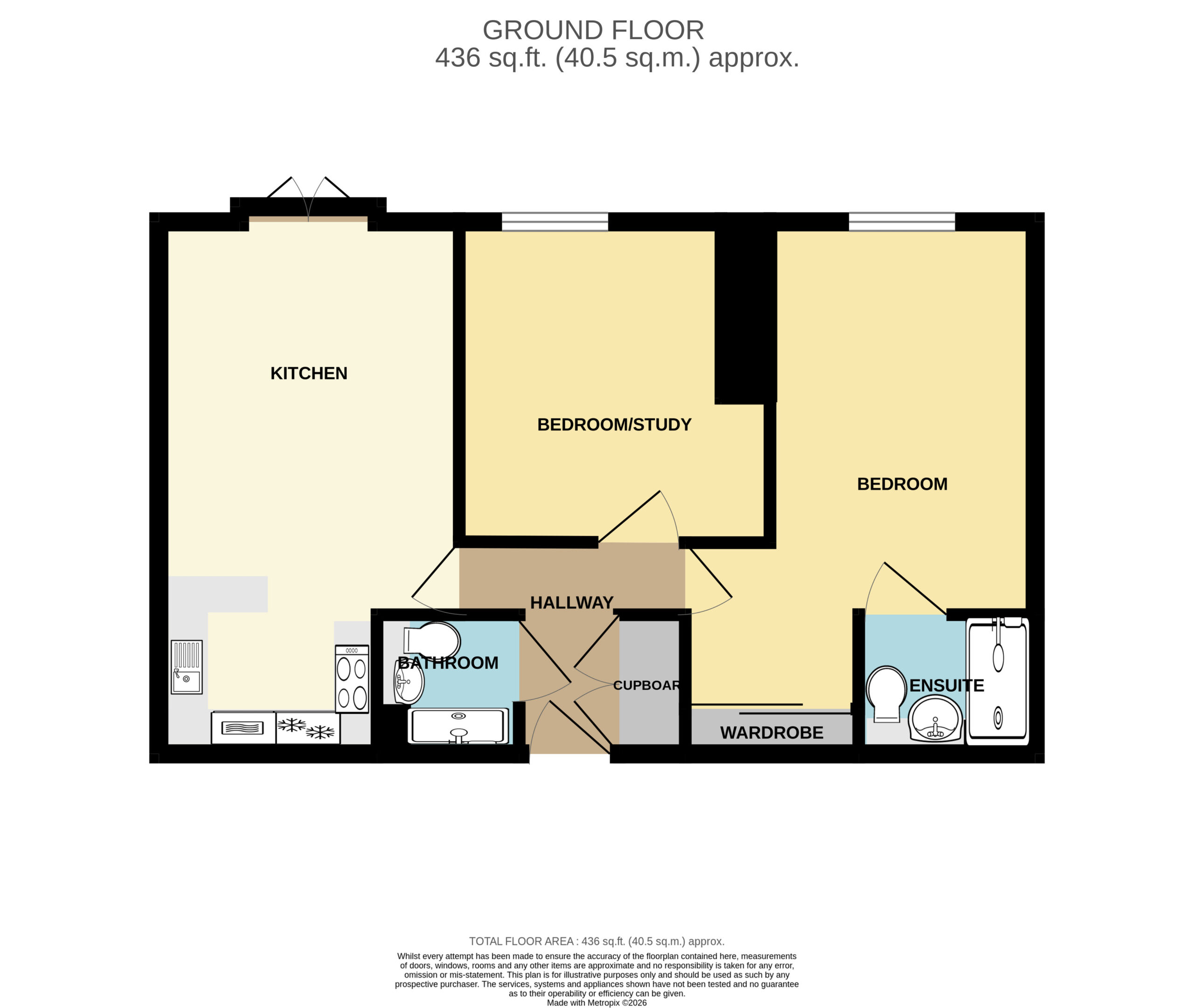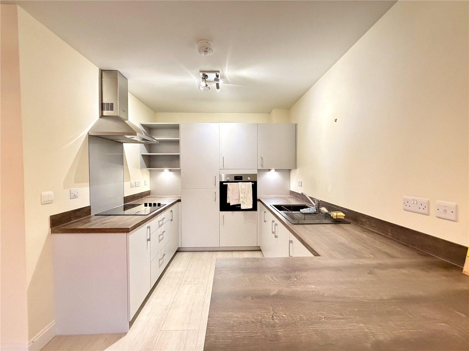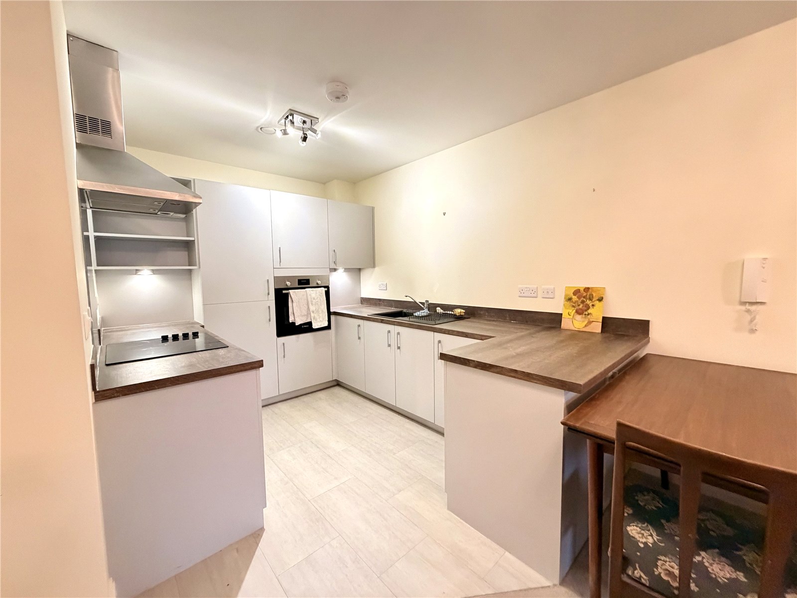 French doors on to Juliet balcony, Integrated fridge/freezer, Electric 4 ring hob, Integrated electric ove, Stainless steel extractor hood, Composite sink with chrome mixer tap.