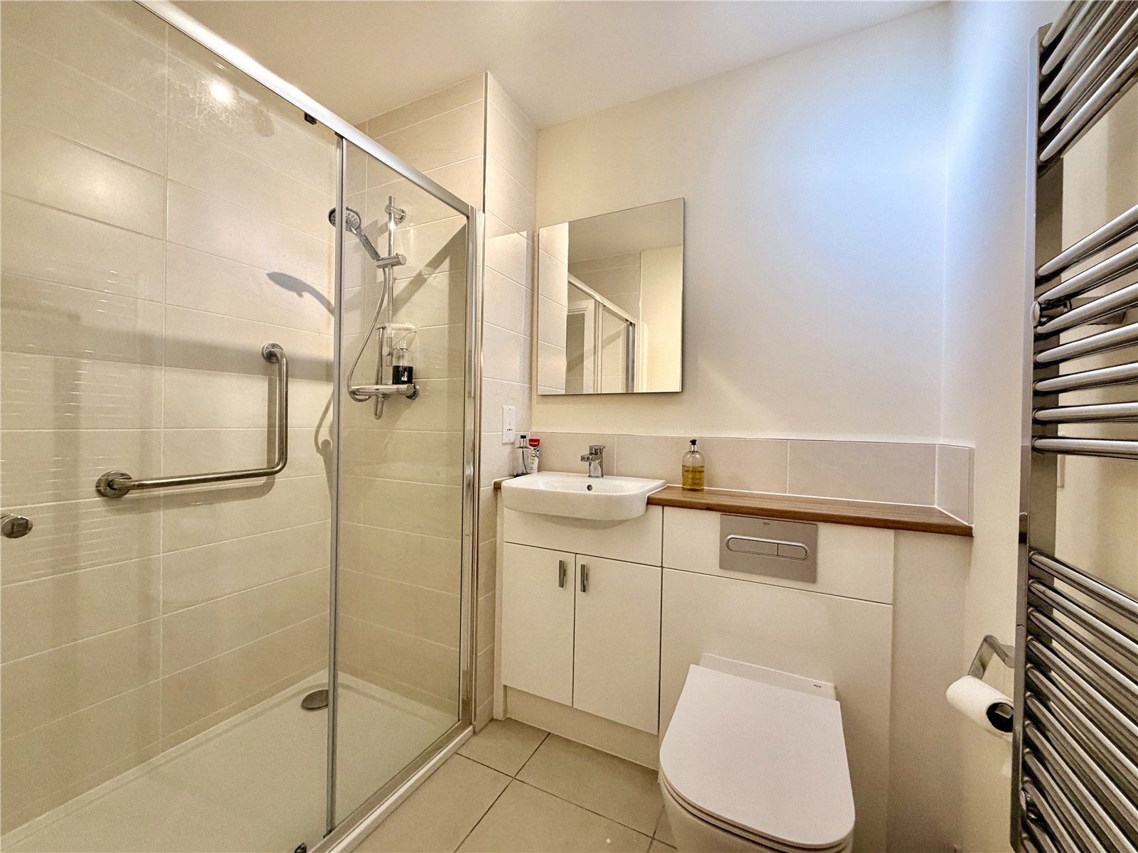 Walk in shower cubicle, Hand wash basin, WC, Electric heated towel ladder.