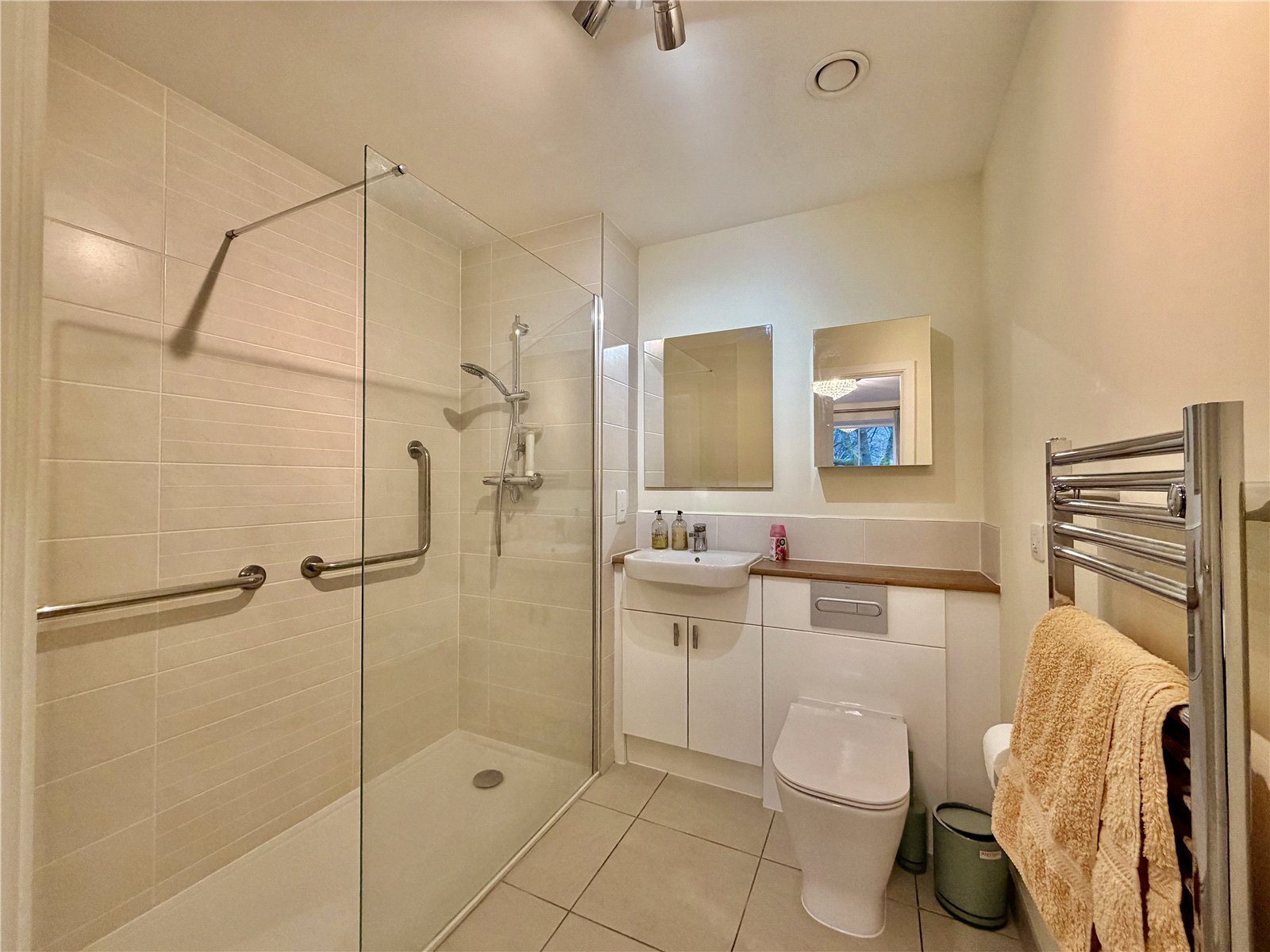 Walk in shower, Hand wash basin, WC, Electric heated towel ladder.