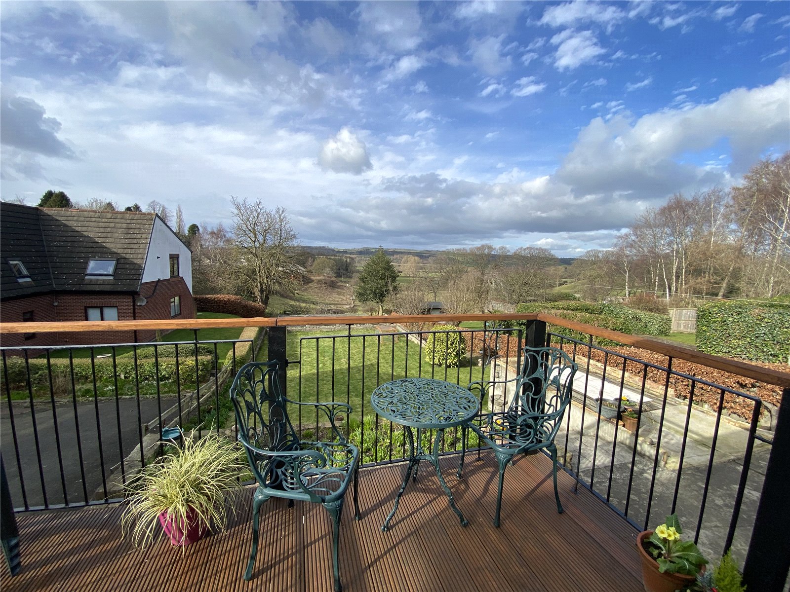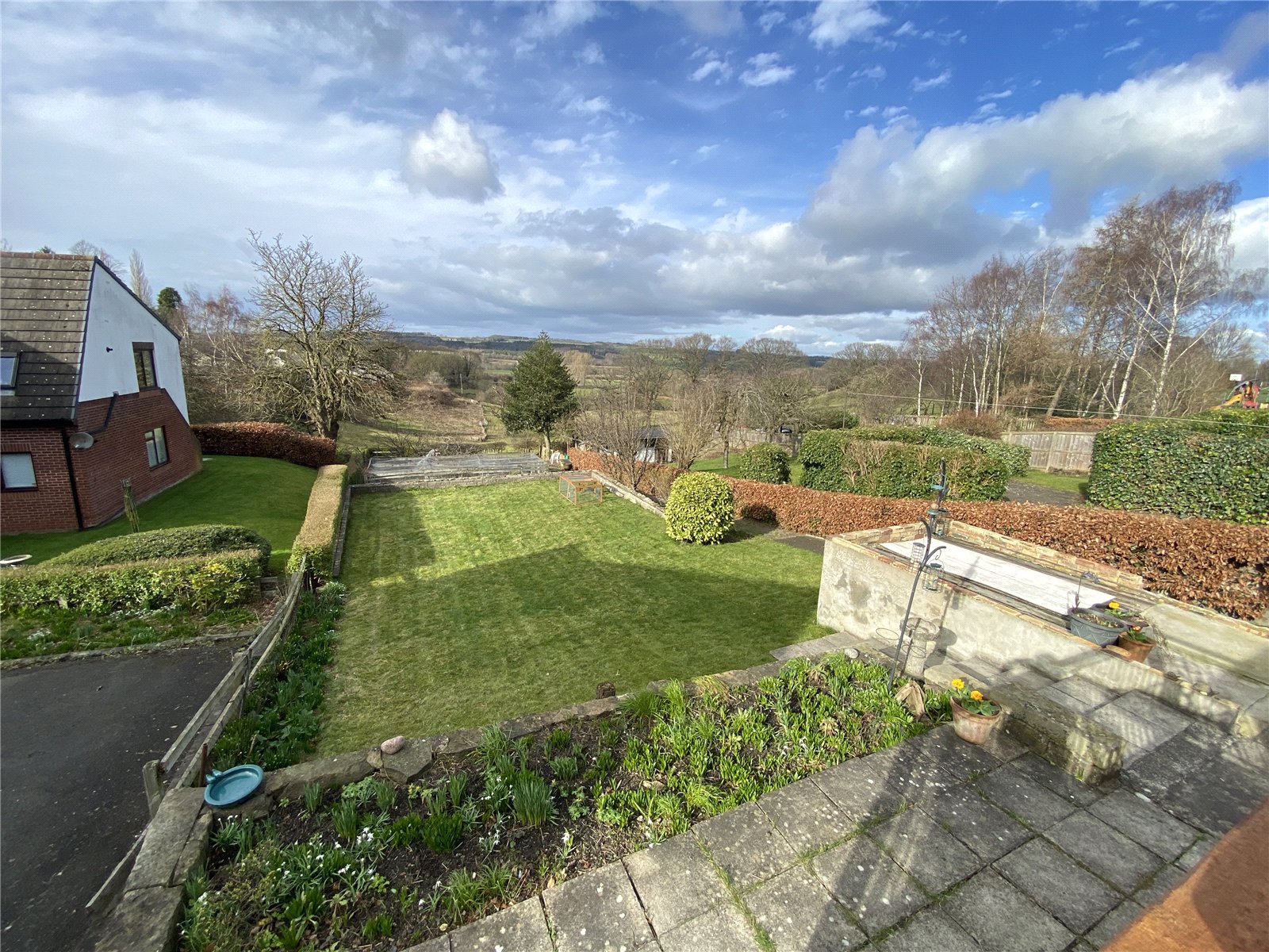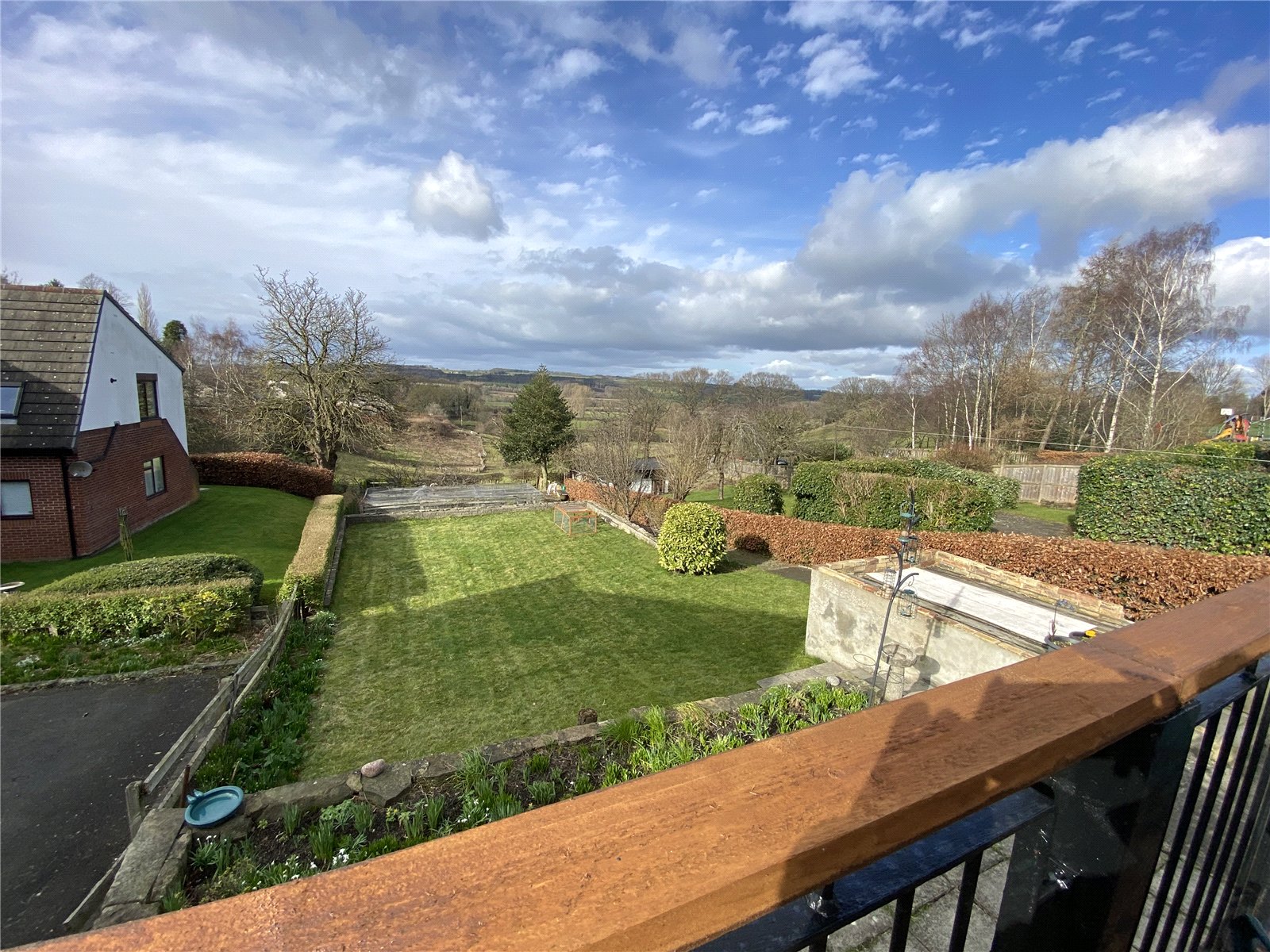 The rear of the property has extensive gardens featuring lawns, vegetable patches, fruit trees, plenty of space for a greenhouse or garden shed. There is a balcony leading from the lounge which gives stunning views over the gardens and beyond.