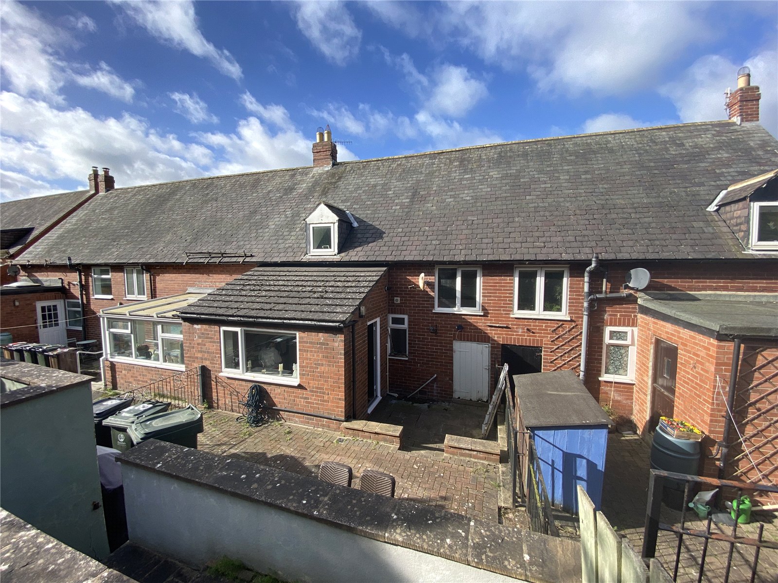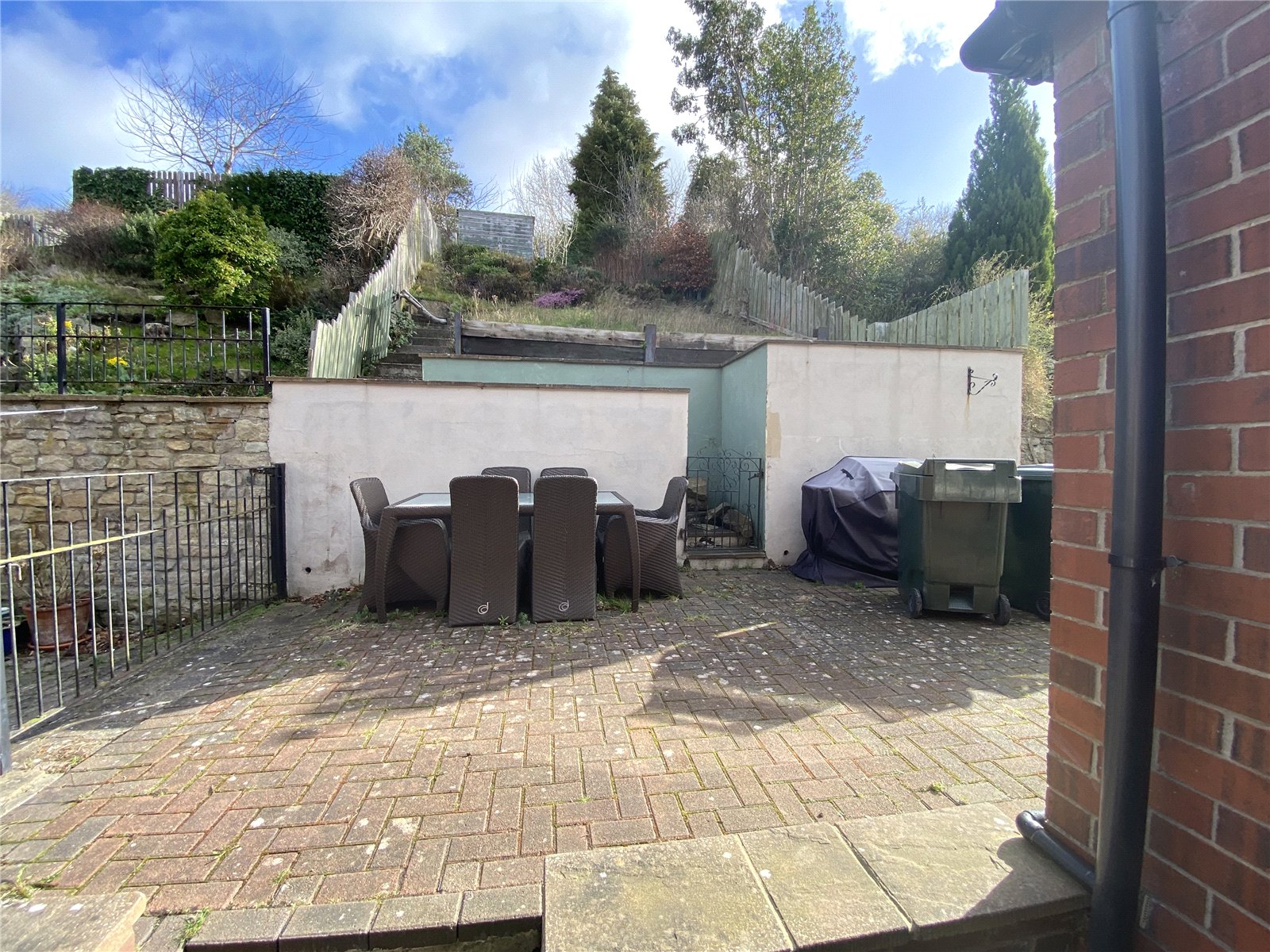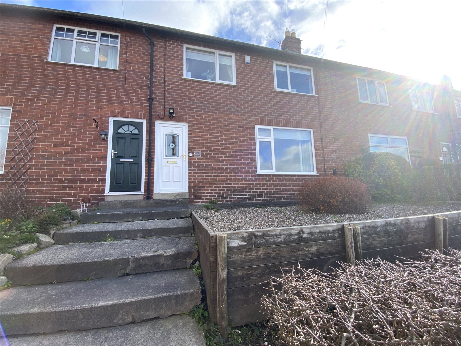 The property boasts a charming front town garden enclosed by hedging, a private rear courtyard, and a generously sized rear garden featuring mature shrubs and a decked seating area ideal for outdoor entertaining.