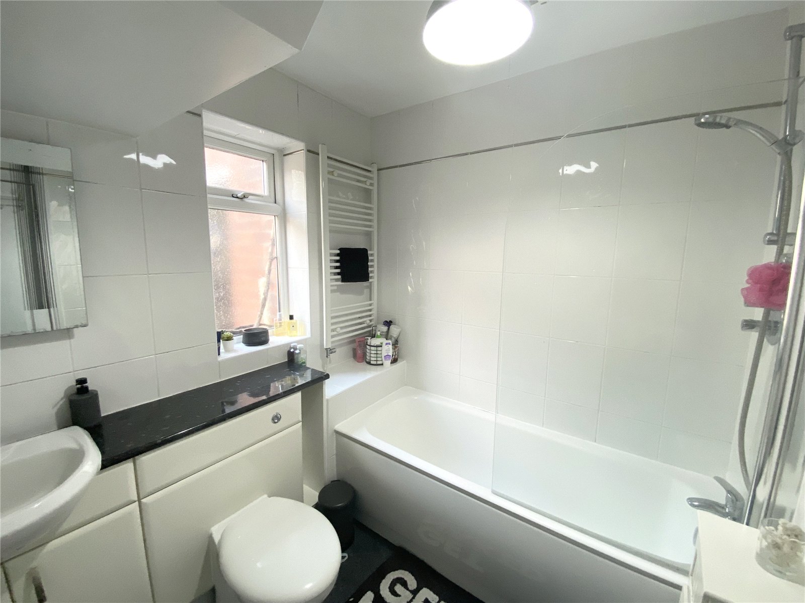 Bath with shower over, wash hand basin set to vanity unit, WC, central heating radiator, double glazed window.