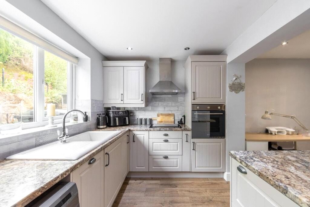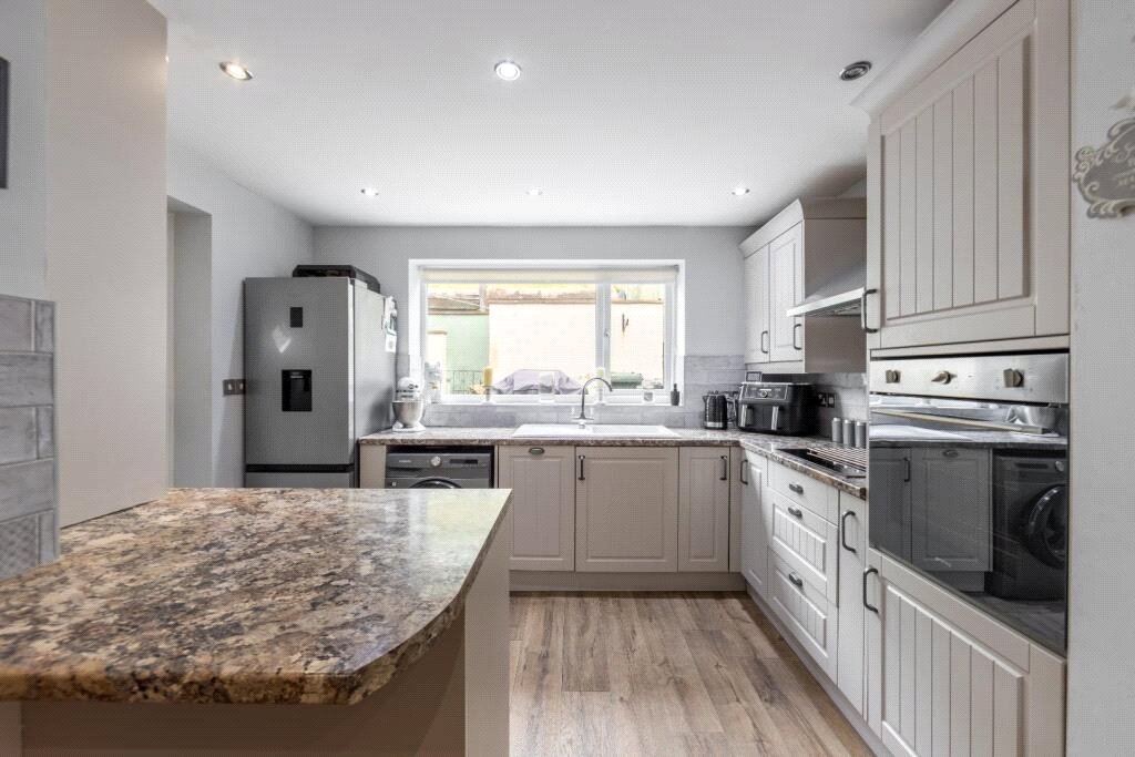 Fitted with a range of wall and base units with work surfaces over, sink and drainer unit, integrated oven and hob, space for washing machine and fridge freezer, breakfast bar, double glazed window, door to external.