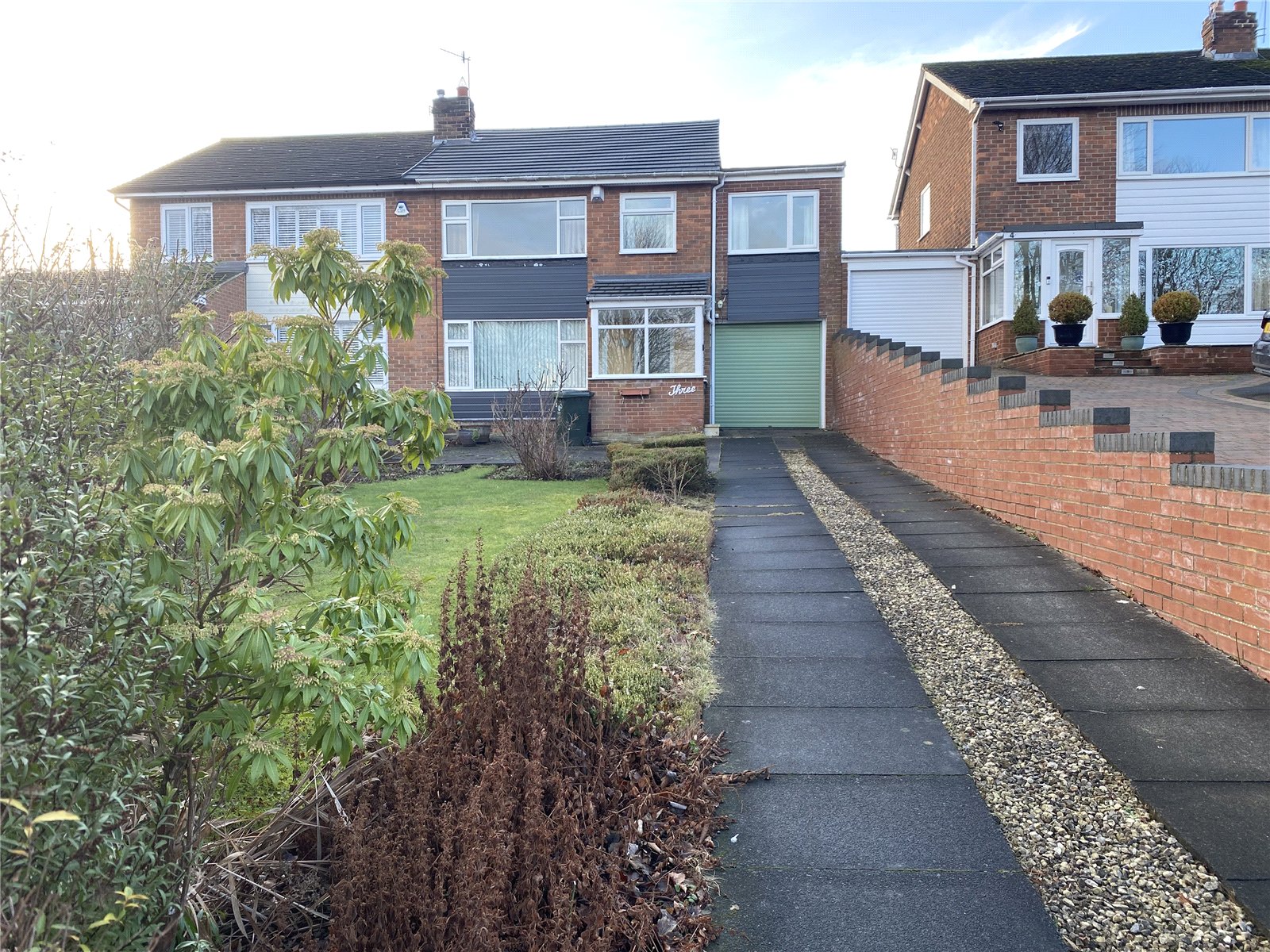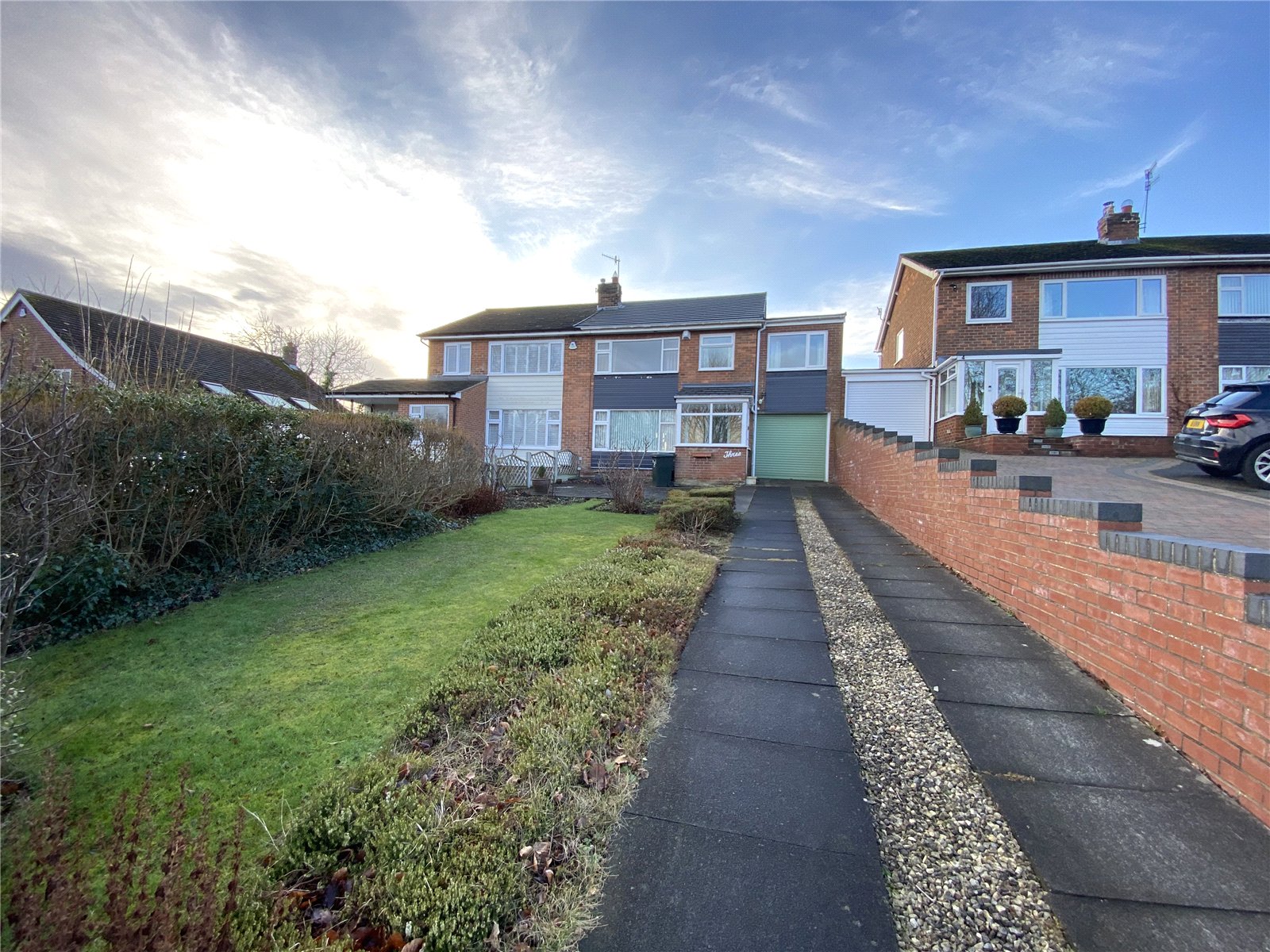Driveway parking leading to single garage, lawned gardens with a variety of well-established shrubs and plants.